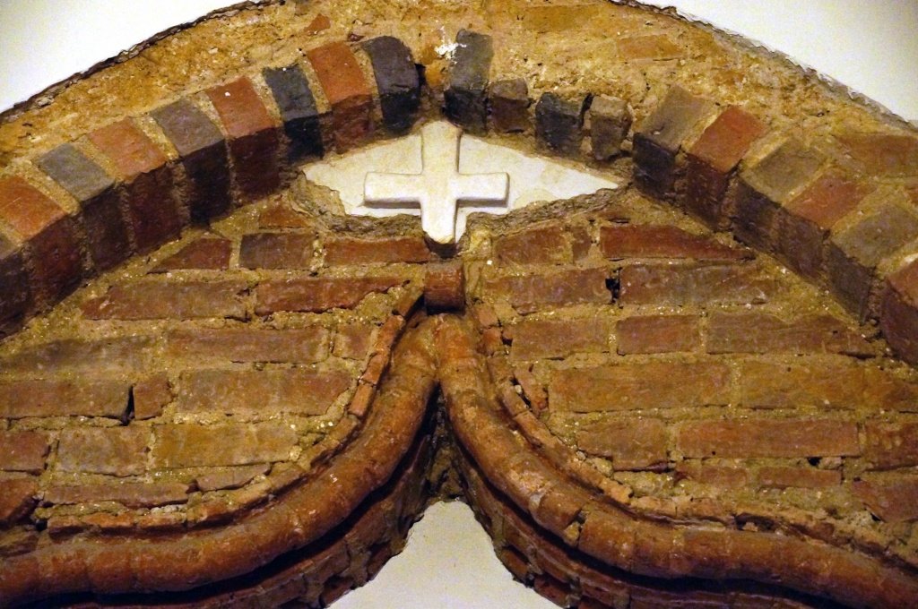 Между прочим, арка сделана из кирпича необычной формы. По всей вероятности, каждый кирпич готовили в единственном экземпляре, чтобы он соответствовал своему месту. И каждый – художественное произведение. На некоторых можно увидеть интересные отпечатки, напоминающие следы животных. Своды же храма выложены фигурным кирпичом, который называют "королевская лилия". Это дает основание предполагать, что с белорусскими зодчими храм строили французы или итальянцы.