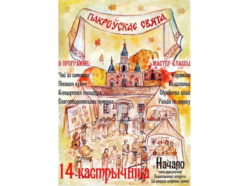 | | 9 ОКТЯБРЯ 2015 (Пятница) 12:47:09 14 октября во внутреннем дворе приходского центра Свято-Покровского кафедрального собора города Гродно (ул. Академическая 2) состоится торжественное открытие праздника "Пакроўскае свята".
