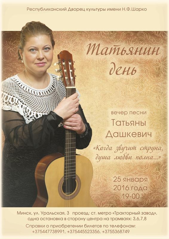 25 января в 19.00 на сцене Дворца культуры имени Н.Ф.Шарко в Минске состоится концерт писательницы, поэтессы, барда Татьяны Дашкевич "Когда звучит струна, душа любви полна...".