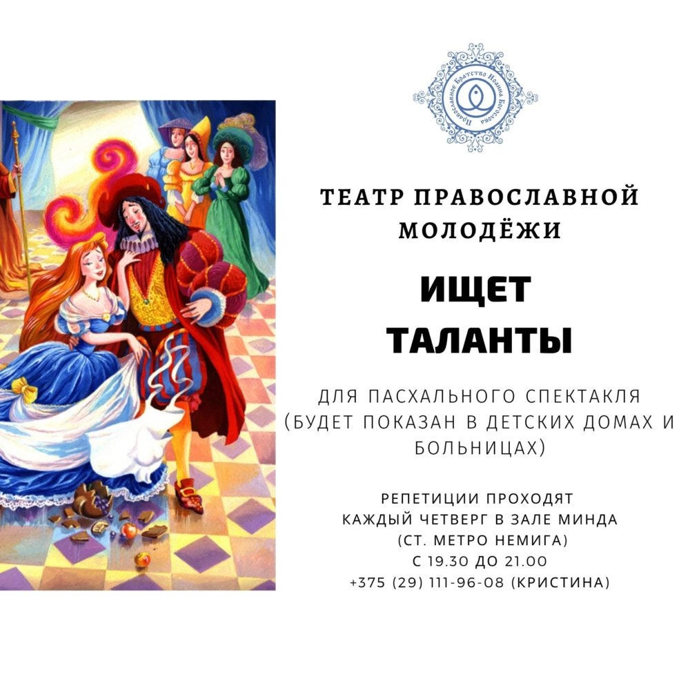 "Театр православной молодёжи" братства Иоанна Богослова при Свято-Духовом кафедральном соборе ищет активных творческих людей для участия в театральных постановках.