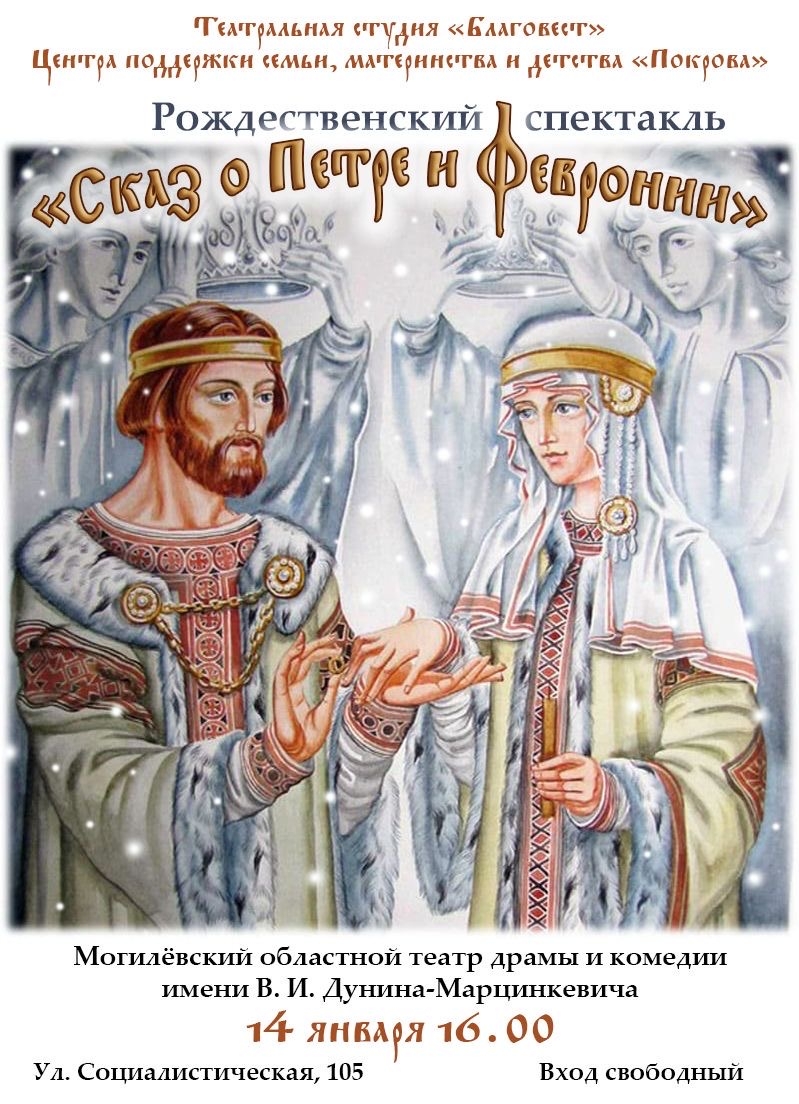 Рождественской традицией Центра "Покрова" является радовать детей и взрослых праздничным спектаклем. В Могилевском областном театре имени В. И. Дунина-Марцинкевича ребят и их родителей, бабушек и дедушек и всех родных ожидает яркая премьера, подготовленная театральной студией "Благовест" Центра Покрова - Рождественский спектакль "Сказ о Петре и Февронии". На большой сцене спектакль состоится 14 января. Начало в 16.00.