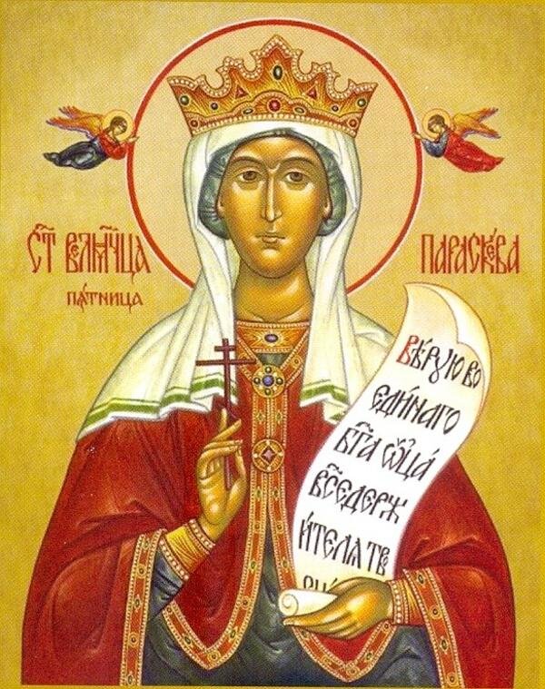 Простой русский народ называл мученицу Параскеву Пятницей, Пятиной, Петкой. Иконы святой Параскевы особенно почитались и украшались нашими предками. Русские иконописцы обыкновенно изображали мученицу суровой подвижницей, высокого роста, с лучезарным венком на голове. Иконы святой мученицы охраняют семейное благополучие и счастье.