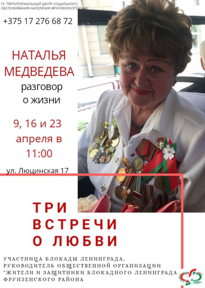 | | 4 АПРЕЛЯ 2019 (Четверг) 10:36:36 В преддверии 9 мая на базе Отделения дневного пребывания пенсионеров Фрунзенского района Минска состоится цикл встреч с жительницей блокадного Ленинграда, руководителем общественной организации "Жители и защитники блокадного Ленинграда Фрунзенского района" Натальей Медведевой. Мероприятие приурочено к 75-летию освобождения Беларуси от немецко-фашистских захватчиков и победе в Великой Отечественной войне.