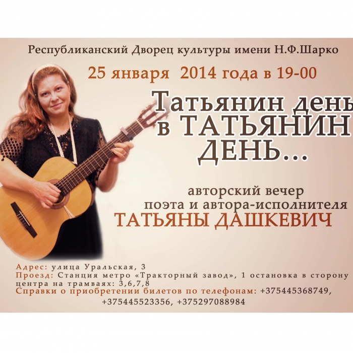 | 18 ДЕКАБРЯ 2013 (Среда) 11:59:05 Один раз в год, в «Татьянин день», поэтесса и автор-исполнительница Татьяна Дашкевич приглашает всех любителей авторской песни на свой авторский вечер. По традиции и в новом, 2014 году, он состоится 25 января, в 19-00, в день памяти великомученицы Татианы, святой покровительницы писательницы. «Этот день мне хочется провести в кругу самых близких людей – моих читателей и моей семьи - мамы и детей, которые обычно присутствуют в зале. Читатели и слушатели с сочувствием и любовью принимают мой дар им в День моего Ангела. Я чувствую любовь людей, растворенную в зале. Этот день для меня – большой праздник, я люблю свое имя, почитаю святую мученицу Татиану и святую царственную новомученицу Татиану. В их славу – этот концерт», - рассказала Татьяна Дашкевич. Многие знают её как автора и серьезных биографических монографий и книг для детей. Православному слушателю полюбились её песни. Среди минчан уже появилась добрая традиция – дарить Татьянам билетики на творческий вечер их талантливой тёзки. Тёплая семейная атмосфера вечера располагает к приятному времяпрепровождению. В зале можно не только послушать песни — не возбраняется и подпевать! Одна из программ Татьяны так и называется «Читаем и поём вместе». «Я знаю, что в зале будет много Татьян. Это очень женский вечер, но мне всегда отрадно видеть девушек, дам и бабушек вместе с их спутниками и, конечно, с детьми. Несколько лет подряд наша встреча проходила в уютной обстановке театра-студии Киноактера. Но в новом году нас примет Республиканский Дворец культуры имени Шарко. Когда-то именно на этой сцене начинали свою деятельность знаменитые «Песняры». Много лет я уже собираюсь начать трудиться над книгой о Владимире Мулявине. Думаю, что пришла пора… А для этого надо прочувствовать творческую обстановку этого зала на себе. Мне очень нравится этот зал, он по-хорошему старинный, широкий, в нём великолепная акустика, сцена хорошо видна с любого места», - отмечает писательница. Ведущей праздничного концерта станет православный общественный деятель и традиционная участница «Татьяниного дня» актриса Ирина Нарбекова. Зрители также смогут услышать фортепианную музыку в исполнении Елены Зеленкевич, без которой не обходится ни один творческий вечер поэтессы. Место проведения: ул. Уральская, 3 (Республиканский Дворец культуры имени Шарко). Проезд: Станция метро «Тракторный завод», 1 остановка в сторону центра на трамваях: 3,6,7,8. Справки о приобретении билетов можно получить по телефонам: +375 (44) 536-87-49, +375 (44) 552-33-56, +375(29) 708-89-84. / sobor.by (просмотров 3723) |