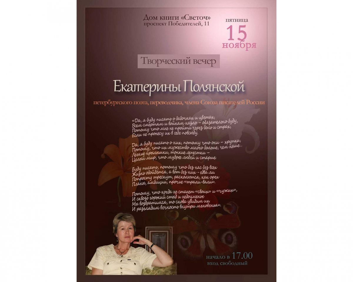 Справка: Полянская Екатерина Владимировна — русский поэт, переводчик с польского и сербского языков. Окончила Санкт-Петербургский государственный медицинский университет им. И.П. Павлова. Автор шести стихотворных сборников ("Бубенцы", 1998; "Жизни неотбеленная нить", 2001; "Геометрия свободы", 2004; "Сопротивление", 2007; "Воин в поле одинокий", 2012; "На горбатом мосту", 2014). Родилась и проживает в Санкт-Петербурге.