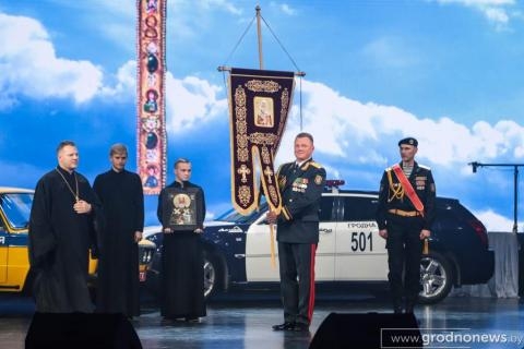 Во время церемонии благочинный Гродненского округа протоиерей Александр Велисейчик торжественно передал начальнику УВД облисполкома Вадиму Синявскому хоругвь - духовное знамя управления внутренних дел и икону святителя Николая.