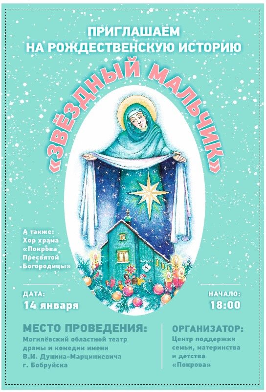 | | 5 ЯНВАРЯ 2022 (Среда) 20:14:04 14 января 2022 года в Могилевском областном театре драмы и комедии им.В.И. Дунина-Марцинкевича города Бобруйска пройдет премьера Рождественской сказки "Звездный мальчик".