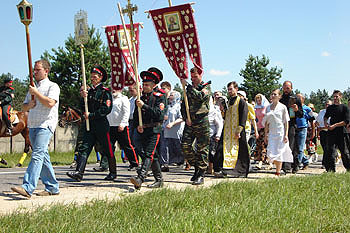 По благословению преосвященнейшего епископа Серафима в Бобруйской епархии проводится акция «Плачущий ангел». В ходе акции, планируется окультурить места, где ранее находились православные храмы, которые были разрушены в советский период. В связи с этим, состоялся крестный ход от Свято-Иверского храма г. Бобруйска в деревню Побоковичи Бобруйского района, целью которого являлось освящение и установка поклонного креста на месте разрушенного Свято-Дмитриевского храма. Активную помощь в организации и участии крестного хода приняли бобруйские казаки. После воскресной Божественной Литургии в Свято-Иверском храме все участники крестного хода в сопровождении настоятеля иерея Сергия Коровинского выдвинулись в путь. Маршрут крестного хода пролегал через деревню Березовичи, далее по Слуцкой трассе до деревни Горбацевичи. В Горбацевичах отец Сергий отслужил молебен перед поклонным крестом, который был установлен ранее на месте разрушенного Свято-Ризоположенского храма в этом селе. После совместной молитвы, крестный ход направился в д. Побоковичи. Храм в честь великомученика Дмитрия Солунского в деревне Побоковичи располагался на местном кладбище. Его еще хорошо помнят люди среднего возраста, так как церковь была разрушена уже в послевоенные годы. На место установки прибыл правящий архиерей Бобруйской епархии епископ Серафим, который и возглавил памятное событие – увековечивание места на котором находился храм поклонным крестом. После краткого молитвословия, владыка поблагодарил участников крестного хода и всех тех, кто принял участия в его организации. На месте установки креста был проведен акт торжественного приема казаков в ряды белорусского казачества. Источник: (просмотров 3454)