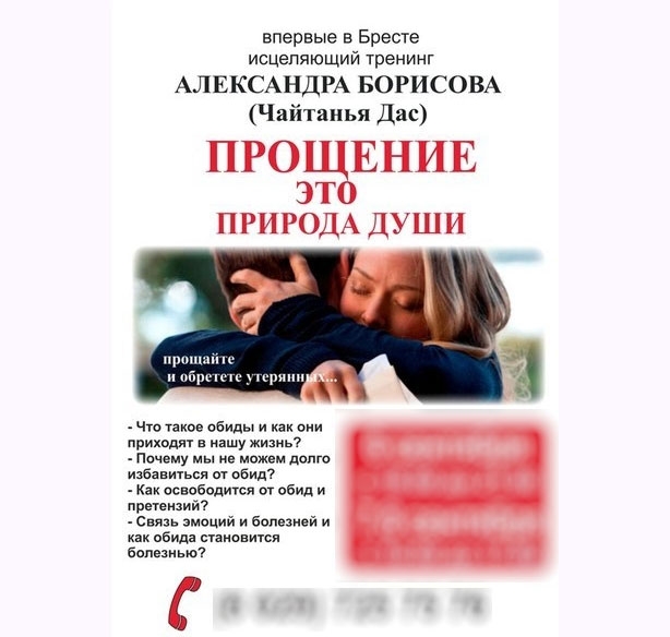 В Бресте появились рекламки «исцеляющих тренингов» от некоего Александра Борисова (он же – Чайтанья дас; имя в переводе с санскрита означает «чистое сознание» или «энергия сознания», а «дас» («раб») - титул «преданных Кришны» наподобие христианского «раб Божий»). За каких-то полмиллиона белорусских рублей он берется рассказать жителям Бреста о пользе прощения и научить вызывать гипервентиляцию лёгких (что в рекламках названо трендовым «практические медитации»).