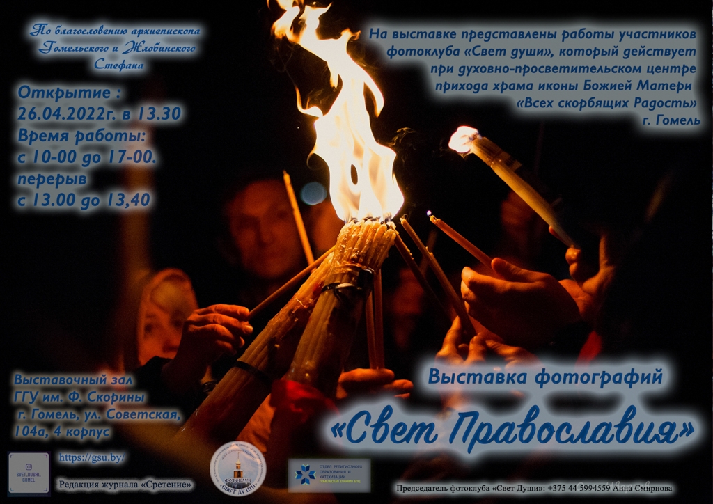 | 27 АПРЕЛЯ 2022 (Среда) 21:46:39 До 13 мая в Выставочном зале Гомельского государственного университета имени Франциска Скорины проходит выставка работ "Свет Православия" участников фотоклуба "Свет Души". Время работы: с 10.00 до 17.00. Обеденный перерыв: 13.00 – 13.40.Праздник Пасхи – это праздник небесной радости, которая неповторимо преображает наш мир. А фотохудожник – это волшебник, способный запечатлеть различные моменты жизни людей для истории и показать их зрителю. Фотографии, представленные на выставке, рассказывают традициях православия на Беларуси. На выставке представлены работы Чистика В., Чваркова О., Злобина И., Крятова А., Полиненко И., Смирновой А., и др. Фотоклуб действует при духовно-просветительском центре прихода иконы Божией Матери "Всех скорбящих Радость" и объединяет фотографов различных уровней мастерства. Председатель фотоклуба "Свет Души": +375 44 5994559 Анна Смирнова. Организаторы выставки: ГГУ им. Ф. Скорины, Фотоклуб "Свет души", редакция журнала "Сретение" Место проведения: Выставочный зал ГГУ им. Ф. Скорины, улица Советская, 104а, 4 корпус./ sobor.by/ eparhiya.by (просмотров 2011) |