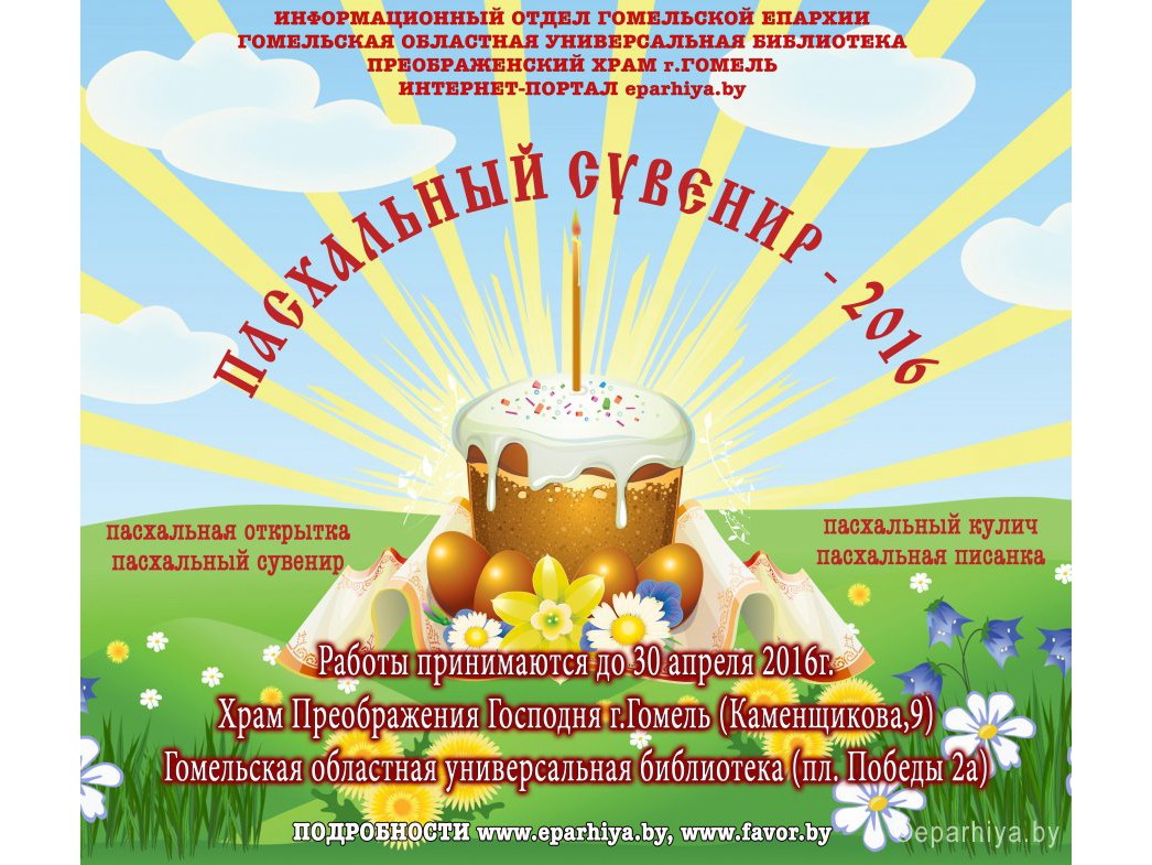 | | 19 АПРЕЛЯ 2016 (Вторник) 11:03:34 Семейный конкурс "Пасхальный сувенир - 2016" стартовал в Гомельской епархии. Конкурс призван напомнить о благотворительности как форме добрых дел, которые являются неотъемлемой частью жизни христианина и осознанию того факта, что делать доброе дело – всегда огромная радость, которая к тому же способна объединять людей разных поколений.
