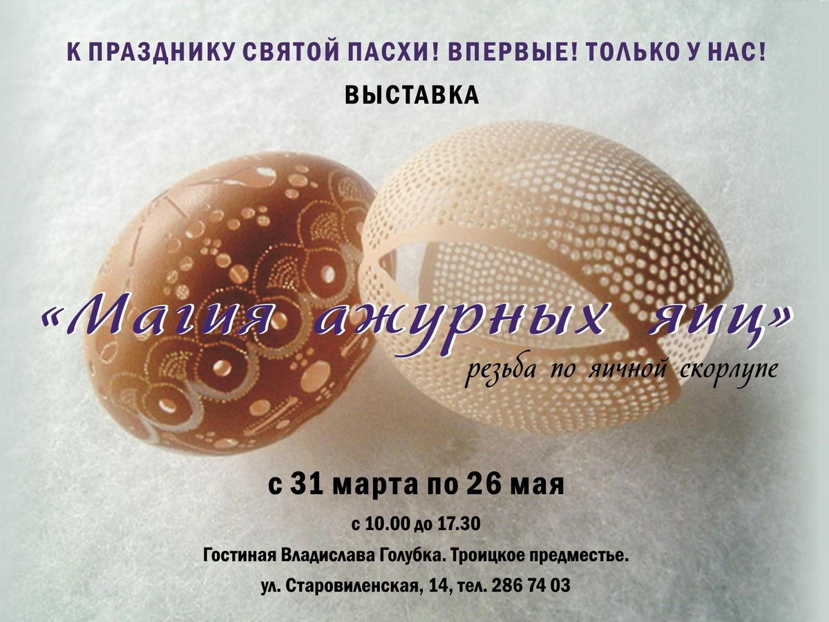 Выставка «Магия ажурных яиц» (резьба по яичной скорлупе), приуроченная к празднику Пасхи, проходит с 31 марта по 26 мая в Гостиной Владислава Голубка (Троицкое предместье, улица Старовиленская, 14).