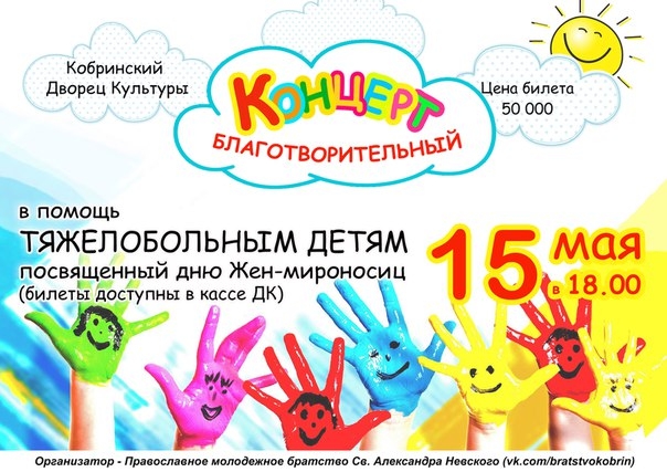 | | 6 МАЯ 2016 (Пятница) 11:32:56 15 мая во Дворце культуры города Кобрина состоится благотворительный пасхальный концерт, посвящённый празднику святых жён-мироносиц. Вырученные средства от продажи входных билетов будут направлены в помощь тяжёлобольным детям.