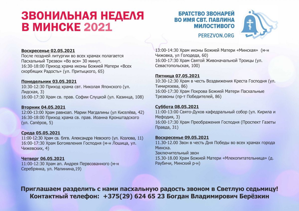 | | 3 МАЯ 2021 (Понедельник) 11:43:47 В дни Светлой седмицы, которая по традиции у звонарей называется звонильной неделей, Отделение звонарей Минского духовного училища приглашает разделить пасхальную радость и насладиться колокольным звоном.