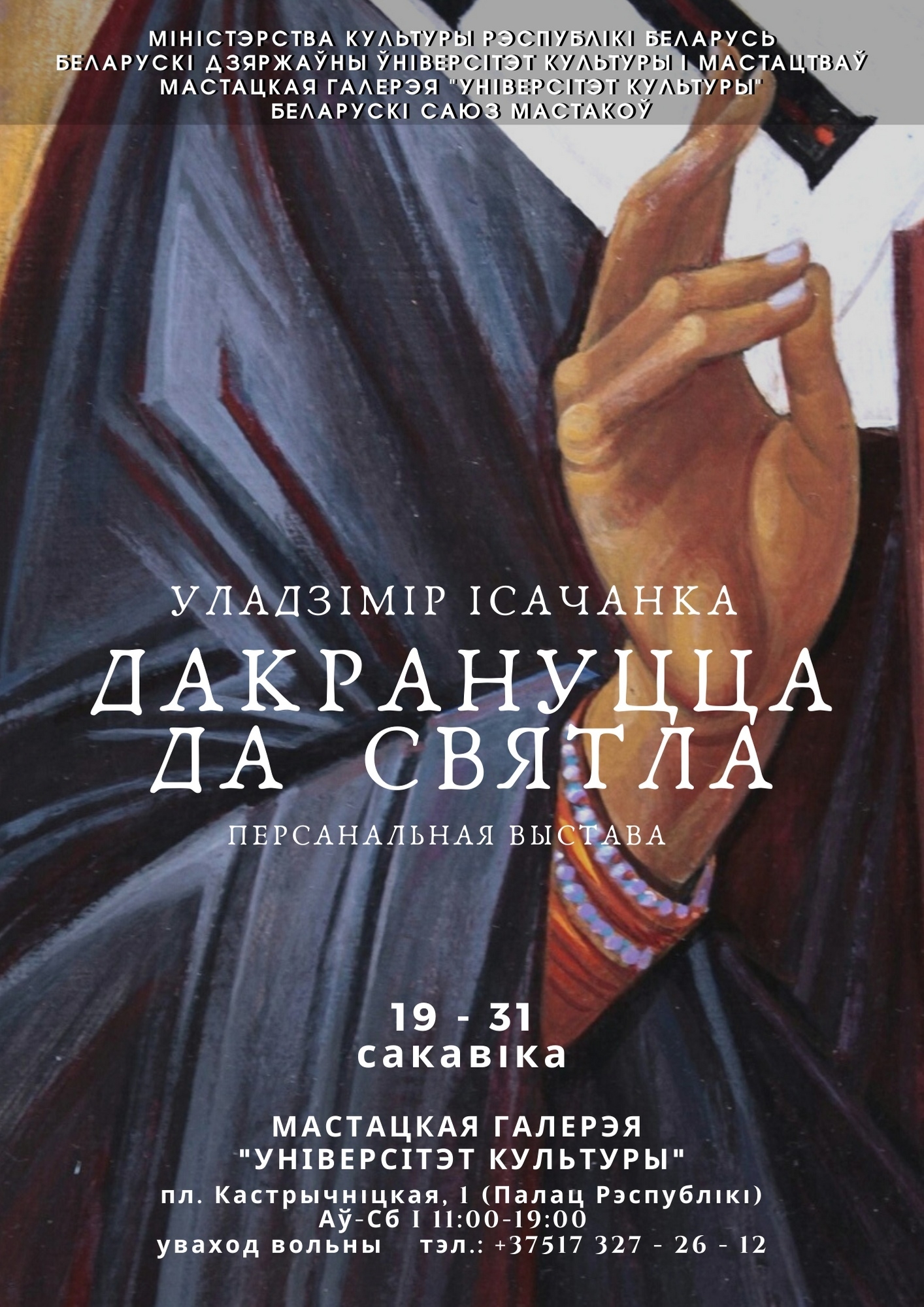 | | 20 МАРТА 2020 (Пятница) 12:49:10 В Минске, в художественной галерее Института культуры, открылась выставка духовной живописи Владимира Исаченко "Дакрануцца да святла".