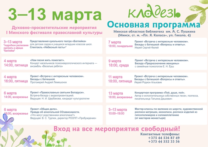 Содействие в подготовке и проведении мероприятия, главными целями которого являются укрепление православных традиций и нравственных ценностей в современном мире и духовное просвещение, оказали Минский горисполком и Минская областная библиотека имени А.С. Пушкина, где и состоялось торжественное открытие фестиваля 3 марта.