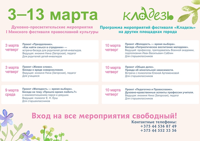 По благословению митрополита Минского и Заславского Павла, Патриаршего Экзарха всея Беларуси, в Минске впервые проходит фестиваль православной культуры "Кладезь", организованный Елисаветинским монастырём и Сестричеством в честь святой преподобномученицы великой княгини Елисаветы.