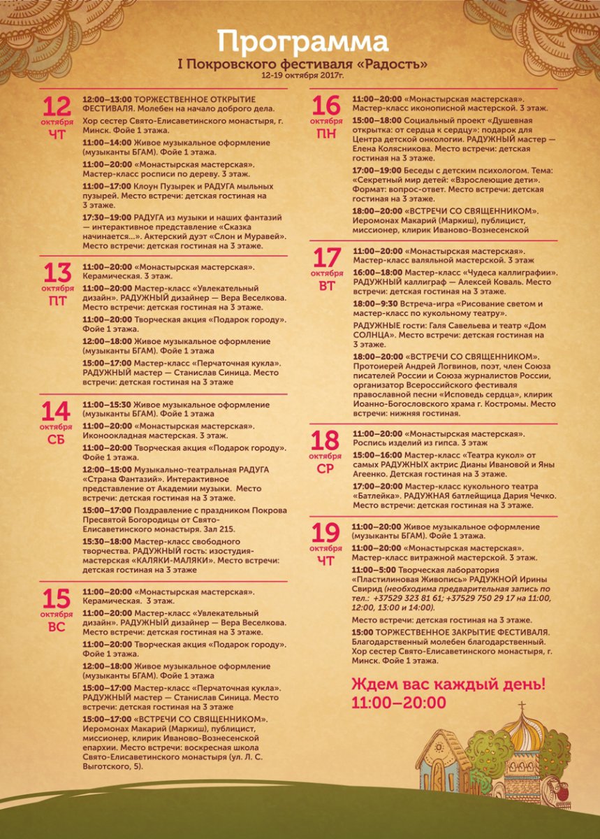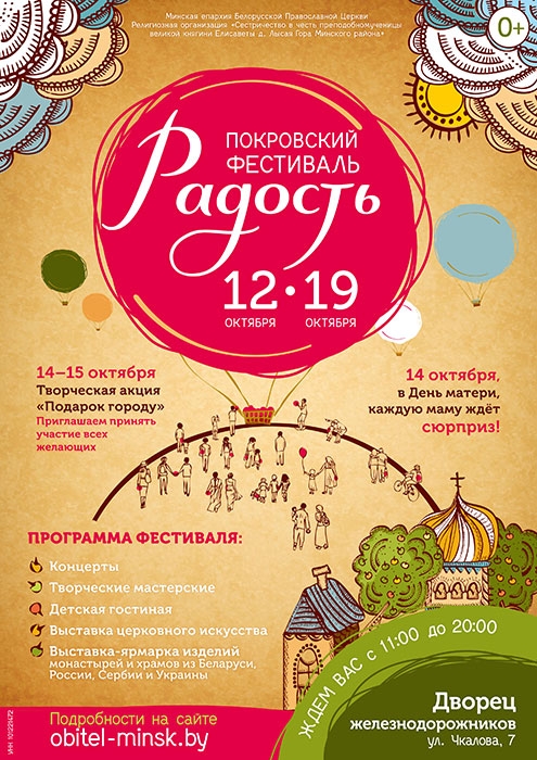 | | 12 ОКТЯБРЯ 2017 (Четверг) 12:00:55 Праздник Покрова Божией Матери у многих минчан ассоциировался с "Покровским кирмашом", который проводился в нашем городе в преддверии важного для верующих людей события. Фестиваль "Радость" с 12 по 19 октября — это и есть та традиция! Поменялся сам формат мероприятия, основной акцент в котором сделан на просветительскую программу.