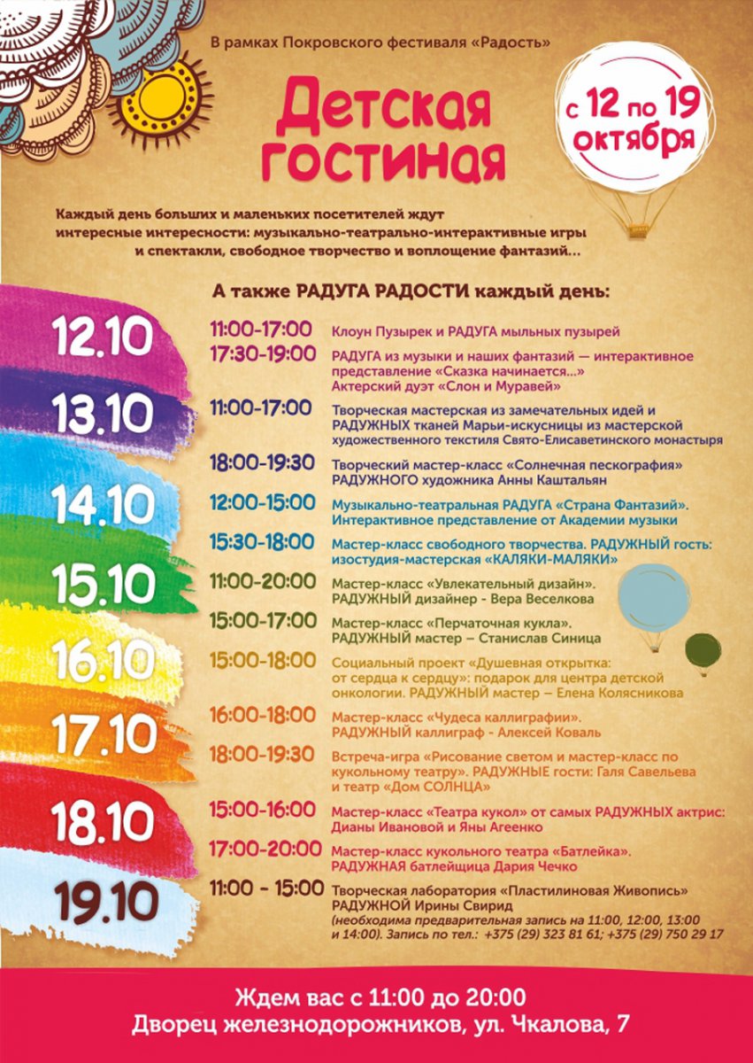 Местом проведения фестиваля "Радость" станет Дворец железнодорожников (г. Минск, ул. Чкалова, 7). Фестиваль будет открыт для гостей с 11:00 до 20:00. Программа мероприятия будет опубликована в ближайшее время.