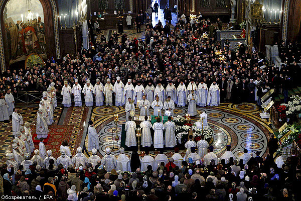 | 9 ДЕКАБРЯ 2008 (Вторник) 12:53:02 Архиереи Русской Православной Церкви, священники и монахи простились с патриархом Московским и всея Руси Алексием II на его отпевании в храме Христа Спасителя. После пения погребального канона патриарший местоблюститель митрополит Смоленский и Калининградский Кирилл прочитал над гробом с телом патриарха разрешительную молитву, смысл которой - в отпущении усопшему всех его вольных и невольных прегрешений. Затем владыка Кирилл вложил свиток с молитвой в правую руку Алексия II, после чего к гробу стали подходить архиепископы и священники, которые прикладывались к кресту в руках покойного патриарха. Многие из тех, кто подходил проститься с Алексием II, не могли сдержать слез. Долго не мог справиться с рыданиями и отойти от гроба архиепископ Истринский Арсений, один из ближайших помощников покойного патриарха. После этого митрополит Кирилл прочитал завершающую отпевание молитву - отпуст, и хор начал многократно петь «Вечная память». После завершения отпевания гроб с телом Алексия II вынесут из храма Христа Спасителя и под звон колоколов обнесут вокруг собора. Затем тело патриарха доставят в Елоховский собор, где состоятся похороны. interfax-religion.ru/ фото с сайта obozrevatel.com(просмотров 2093) |