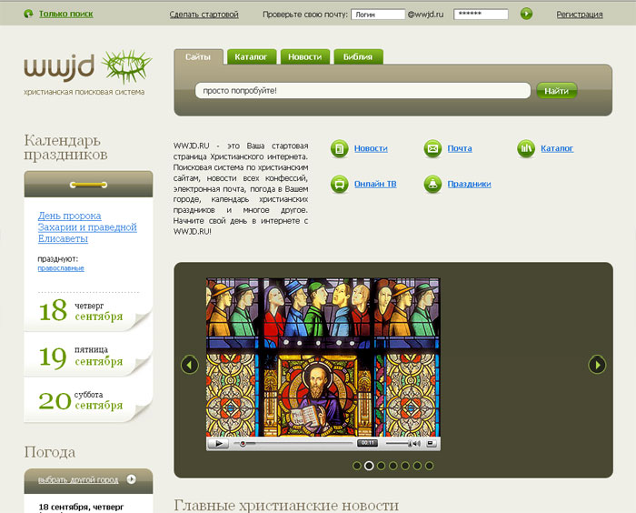 | | 17 СЕНТЯБРЯ 2008 (Среда) 16:31:17 Ее аббревиатура в переводе с английского означает «Как бы поступил Иисус?» ( «What would Jesus do?»). Система дает возможность выхода только на христианские сайты. Причем поиск осуществляется на основе передовых поисковых алгоритмов Google.com. В настоящее время база WWJD.RU насчитывает порядка двух тысяч веб-сайтов. В 2009-ом году поисковый индекс будет увеличен до пятидесяти тысяч ресурсов всех конфессий и охватит как российские, так и сайты СНГ и стран Балтии. На новостных лентах WWJD.RU можно познакомиться с событиями, предоставленными ведущими христианскими новостными агентствами всех конфессий. На сайте также предлагается удобный формат просмотра телеканалов, ведущих трансляцию в интернете. Онлайн-трансляция программ осуществляется в прямом эфире на русском, украинском и английском языках. Здесь размещается и подробная информация о христианских праздниках. На портале можно также зарегистрировать бесплатный почтовый ящик. Уникальная христианская почтовая служба с объемом дискового пространства 7 Гб для каждого аккаунта оснащена передовыми технологиями - средством поиска нужных писем, службой обмена мгновенными сообщениями, работающей прямо через интерфейс браузера. (просмотров 2971) |