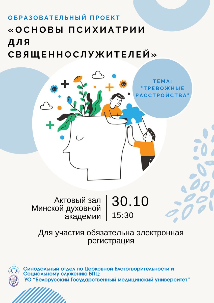 В рамках образовательного проекта ежемесячно проводятся лекции. Очередная лекция будет посвящена теме тревожных расстройств и состоится в актовом зале Минской духовной академии 30 октября в 15:30.