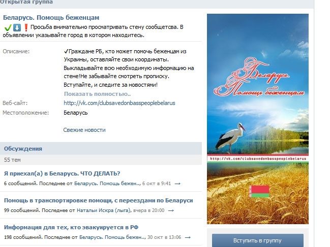 | | 3 НОЯБРЯ 2014 (Понедельник) 15:19:45 В социальной сети «ВКонтакте» появилась группа «Беларусь.Помощь беженцам», содержащая информацию о том, как и где получить помощь беженцам, приехавшим в Беларусь с Украины. На стене группы размещена информация об оказании юридической помощи, поиске жилья и работы. Представлены также волонтёрские организации и социальные службы, их адреса и контактная информация. Есть и частные объявления об оказании помощи одеждой, продуктами, мебелью и т.п.