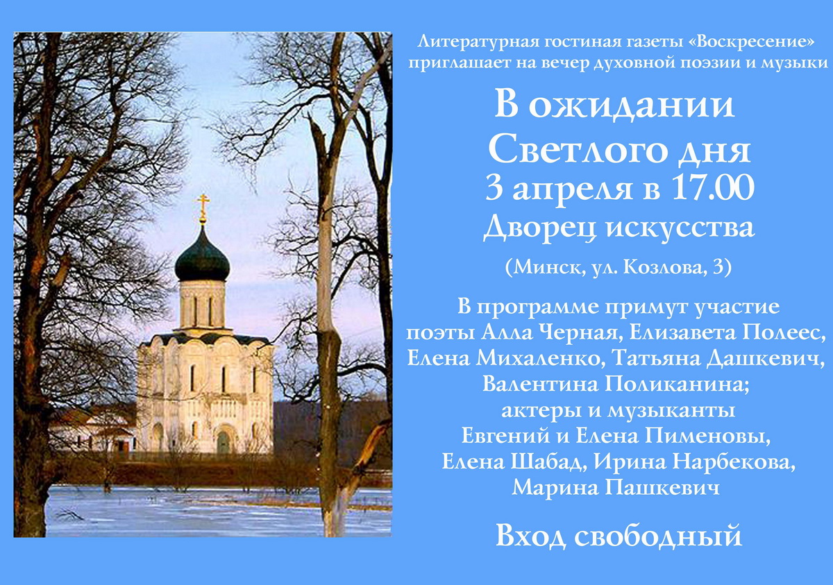 Литературная гостиная газеты «Воскресение» приглашает на вечер духовной поэзии и авторской песни «В ожидании Cветлого дня», который состоится 3 апреля во Дворце искусств в Минске. Мероприятие пройдёт в рамках 13 духовно-просветительской программы выставки-ярмарки «Вербны кiрмаш».