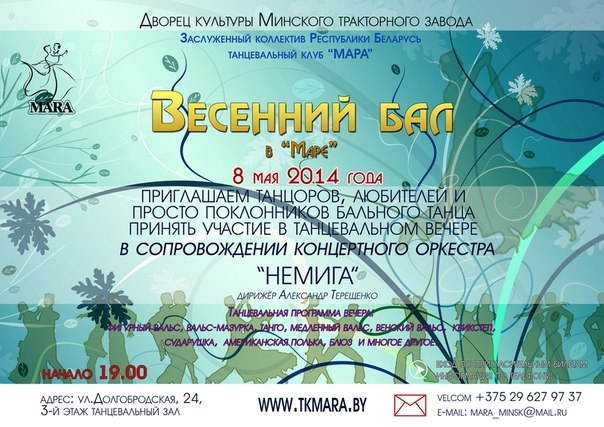 | | 23 АПРЕЛЯ 2014 (Среда) 15:03:33 8 мая в 19.00 в зале ДК Минского тракторного завода состоится танцевальный вечер «Весенний бал» - об этом сообщила член оргкомитета Минского бала православной молодёжи Людмила Канаш.