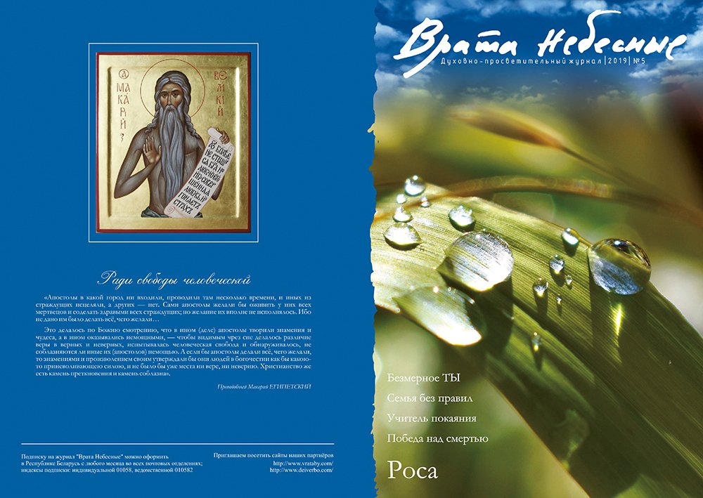 В печать вышел новый, пятый, номер журнала "Врата Небесные". Темы номера: проблемы семьи и воспитания трудных детей; духовная ценность церковнославянского и русского языков; сказки как средство воспитания души; 30-летие первых сестричеств Беларуси; жизненный путь и творчество двух архиереев, обладавших незаурядным литературным талантом; Вознесение Господне.