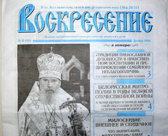 | | 15 ДЕКАБРЯ 2008 (Понедельник) 16:28:38 12 декабря вышел в свет 12-й номер православной газеты «Воскресение». Его материалы посвящены памяти Святейшего Патриарха Московского и всея Руси Алексия II, а также обзору прошедших в Минске Свято-Евфросиниевских и Свято-Михайловских чтений. Для обсуждения читателям предложены темы о милосердии к ближним, милостыни и благотворительности. В рубрике «Православие на Беларуси» размещена статья священника Алексия Хотеева о жизни Церкви во время фашистской оккупации. Как рассказала нашему корреспонденту главный редактор газеты Елена Михаленко, в издании читатель найдет советы по рождественскому украшению дома./sobor.by / Ольга Михаленко/ (просмотров 2782) |