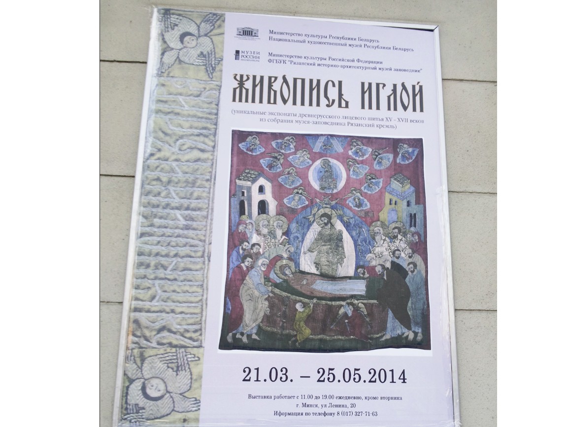 | | 20 МАРТА 2014 (Четверг) 15:59:32 Выставка древнерусского лицевого шитья «Живопись иглой» из собрания Рязанского историко-архитектурного музея-заповедника «Рязанский Кремль» пройдёт с 21 марта по 25 мая в Национальном художественном музее.