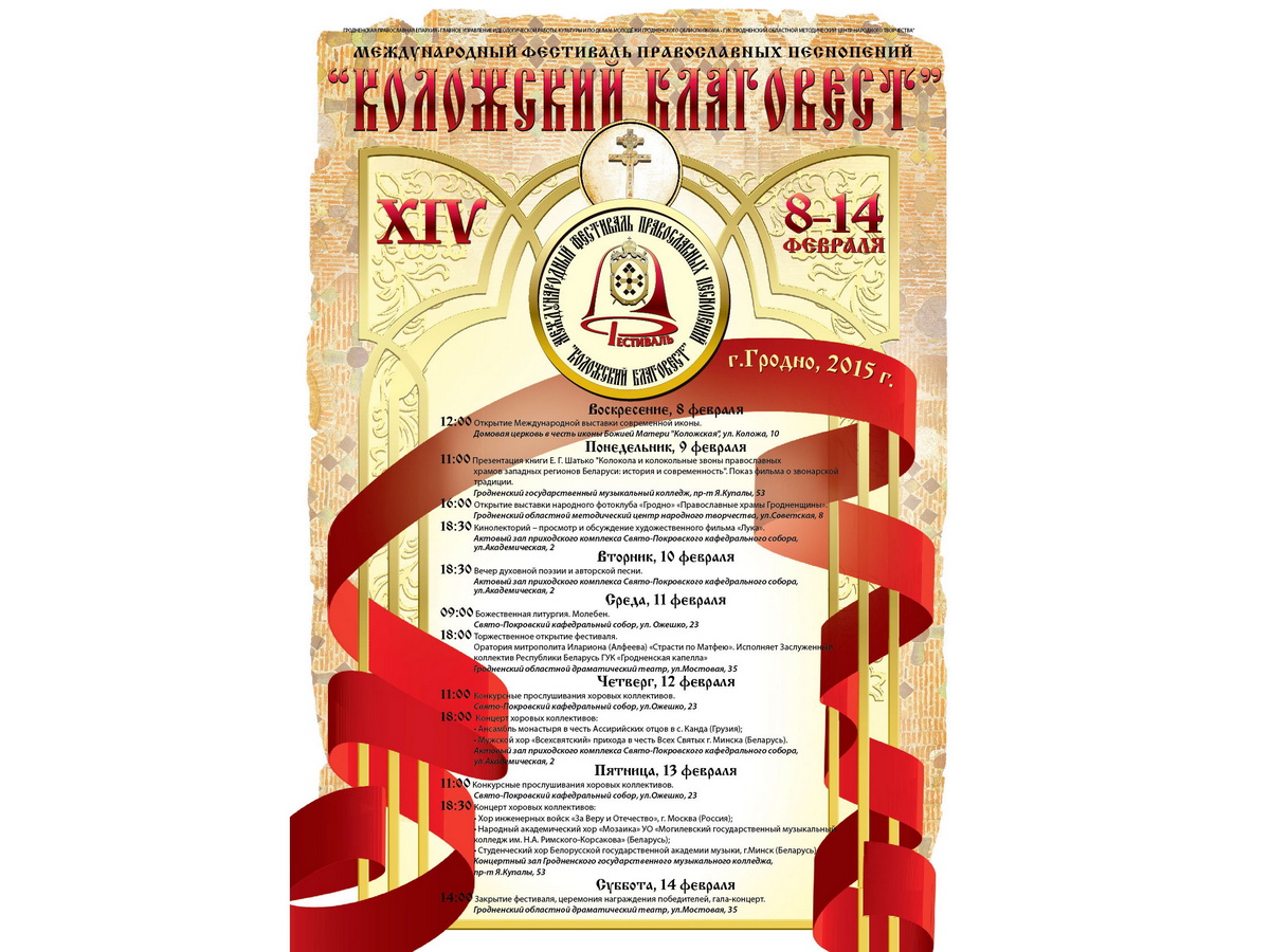 | 4 ФЕВРАЛЯ 2015 (Среда) 14:39:06 С 11 по 14 февраля в Гродно пройдёт XIV Международный фестиваль православных песнопений «Коложский Благовест», участие в котором примут приходские и светские хоровые коллективы из Беларуси, Румынии, России, Украины Польши и Литвы, - сообщает сайт Гродненской епархии. Впервые свои коллективы - церковный и светский - на песенном форуме представит Молдова. Также в конкурсной программе выступят хоры детских воскресных школ, приходские хоры и ансамбли, любительские детские и взрослые коллективы - всего около 40 коллективов. В рамках духовно-просветительской программы фестиваля 8 февраля в приходе храма в честь святых Бориса и Глеба в Гродно откроется выставка икон современных иконописцев. Посетители смогут увидеть иконы мастеров из Беларуси, Литвы, Польши и Украины. В этот же день состоится презентация книги кандидата искусствоведения, действительного члена Ассоциации колокольного искусства России Елены Шатько «Колокола православных храмов Западной Беларуси». Также во время фестиваля запланировано проведение фотовыставок, кинолекториев, пройдут вечера духовной поэзии и авторской песни. Впервые фестиваль православных песнопений состоялся в Гродно в 2002 году и был приурочен к 10-летию возрождения Гродненской епархии. Своё название «Коложский благовест» фестиваль получил в 2008 году. Целью фестиваля является сохранение и развитие певческой православной культуры, повышение исполнительского уровня православных песнопений в приходских и светских коллективах. Программа фестивальных мероприятий Воскресенье, 8 февраля 2015 года 12:00 - Открытие Международной выставки современной иконы (домовая церковь в честь иконы Божией Матери «Коложская», ул. Коложа, 10). Понедельник, 9 февраля 11:00 - Презентация книги Е. Г. Шатько «Колокола и колокольные звоны православных храмов западных регионов Беларуси: история и современность». Показ фильма о звонарской традиции (Гродненский государственный музыкальный колледж, пр-т. Я.Купалы, 53). 16:00 - Открытие выставки народного фотоклуба «Гродно» «Православные храмы Гродненщины» (Гродненский областной методический центр народного творчества, ул. Советская, 8). 18:30 - Кинолекторий - просмотр и обсуждение художественного фильма «Лука» (актовый зал приходского комплекса Свято-Покровского кафедрального собора (ул. Академическая, 2). Вторник, 10 февраля 18:30 - Вечер духовной поэзии и авторской песни (актовый зал приходского комплекса Свято-Покровского кафедрального собора, ул. Академическая, 2). Среда, 11 февраля 09:00 - Божественная литургия. Молебен (Свято-Покровский кафедральный собор, ул. Ожешко, 23). 18:00 - Торжественное открытие фестиваля. Оратория митрополита Илариона (Алфеева) «Страсти по Матфею». Исполняет Заслуженный коллектив Республики Беларусь ГУК «Гродненская капелла» (Гродненский областной драматический театр, ул.Мостовая, 35). Четверг, 12 февраля 11:00 - Конкурсные прослушивания хоровых коллективов (Свято-Покровский кафедральный собор, ул.Ожешко, 23). 18:00 - Концерт хоровых коллективов: - ансамбль монастыря в честь Ассирийских отцов в с. Канда (Грузия); - мужской хор «Всехсвятский» прихода в честь Всех Святых г. Минска (Беларусь) (актовый зал приходского комплекса Свято-Покровского кафедрального собора, ул. Академическая, 2). Пятница, 13 февраля 11:00 - Конкурсные прослушивания хоровых коллективов (Св