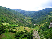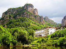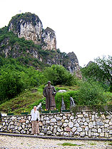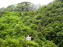 Обитель находится в живописнейшем уголке, где очень легко дышится. Благотворно влияет на душу журчание бегущих с гор чистых голубых ручейков. Над монастырем на скале ( место бывшей башни древнего города) величественно возвышается Крест который освятил Святейший Патриарх Сербский Павел. Это историческое место. Некогда здесь был сербский город, В 13-м веке турки полностью его разрушили. Развалины крепостной стены - молчаливые свидетели героического подвига его защитников. Крест воздвигнут над темницей, где завоеватели предавали мучениям сербов в древние времена, он установлен в память этих людей, а также в память жертв второй мировой войны и бомбежек Югославии в 1999 году. Поднимались наверх минут сорок. На протяжении всего пути на расстоянии одного-двух поворотов дороги нас встречали написанные на камнях и установленные в небольших пещерках, одна за другой, десять Заповедей Божиих. Останавливаясь возле них, мы старались прочесть то, что написано по сербски ,читали вслух, вновь осмысливали Божий завет, а вокруг необыкновенной красоты горы, вдали виднеющиеся селения белые с красными крышами, маленькие поля, стога сена, не такие как у нас а на шестах - горные. Стадо овец, идущее под предводительством своего вожака , звенящее колокольчиками, и подгоняемое неспешно маленьким мальчишкой, все очень спокойно, неспешно и невозможно поверить, что совсем недавно здесь было сурово и опасно, но Слава Богу - сейчас мирно. И так ступенька за ступенькой, осторожно и медленно мы поднимались к Кресту.