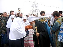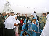 На площади перед церковью Его Высокопреосвященство хлебом-солью встречали сёстры милосердия, сотрудники церковных мастерских с умственными ограничениями, которые преподнесли владыке изделия собственных рук, многочисленные прихожане.