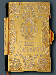 «Евангелие» – самая главная часть Священного Писания Нового Завета, в которой изложены слова и деяния Господа Христа, содержит в себе повествования четырех евангелистов: Матфея, Марка, Луки и Иоанна. Евангелие обычно украшено красивым окладом, на лицевой части которого находится изображение Христа, воскресшего из мертвых, и лики четырех евангелистов. Слово «Евангелие» в переводе с греч. означает «Благая весть» – это проповедь о божественном достоинстве Иисуса Христа, которое явно открылось в Его тридневном воскресении. Евангелие находится в главной части храма – алтаре, на престоле, и символизирует присутствие в храме Христа, Сына Божия, Который в Священном Писании именуется также Словом Божиим (Ин.1,1).