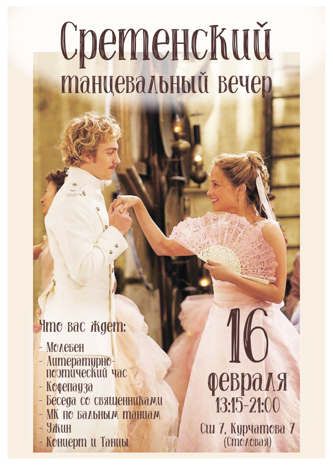| | 11 ФЕВРАЛЯ 2020 (Вторник) 13:05:06 16 февраля в Гродно cостоится Сретенский танцевальный вечер. Молодёжная встреча приурочена ко Дню православной молодёжи, который отмечается ежегодно в праздник Сретения Господня.