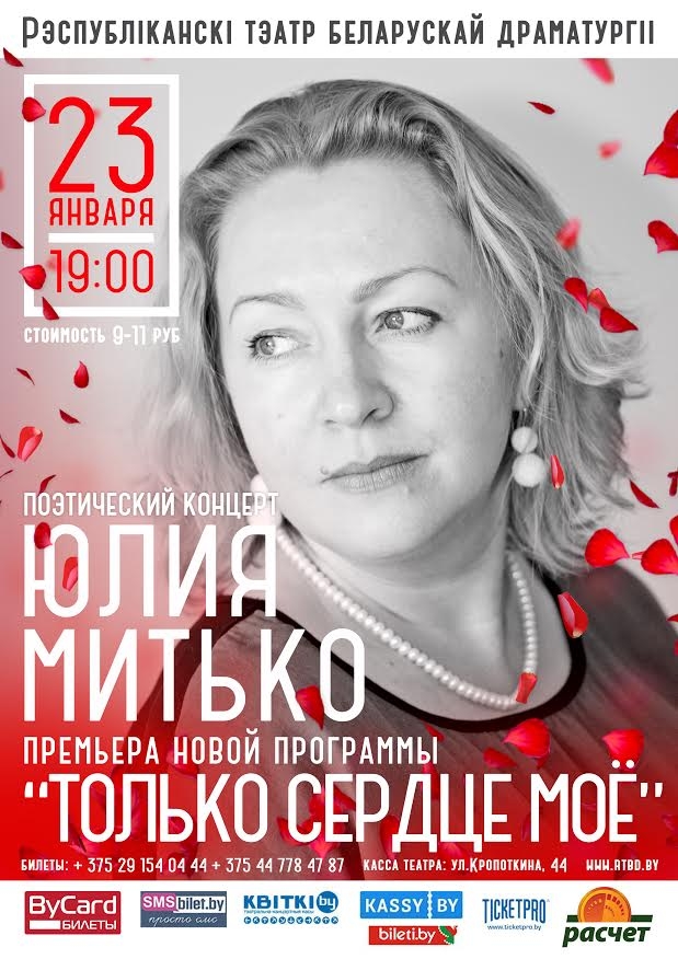 | | 3 ЯНВАРЯ 2017 (Вторник) 12:33:44 Премьера новой программы Юлии Митько "Только сердце моё" состоится 23 января в Республиканском театре белорусской драматургии. Начало в 19.00.