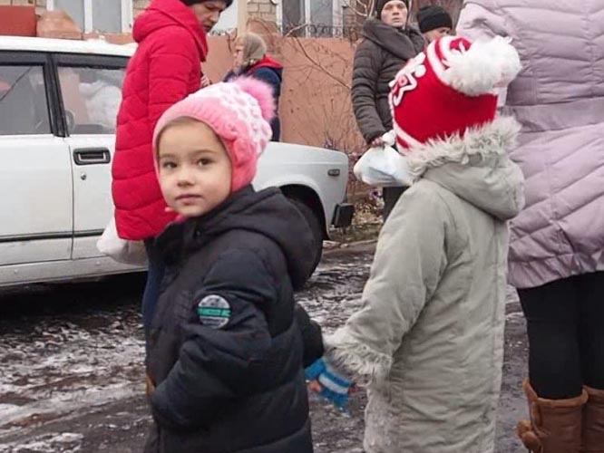 В посёлок Трудовские Петровского района г. Донецка, где, несмотря на ежедневно простреливаемые улицы, проживает большое количество детей. Белорусские волонтёры также привезли туда продуктовые наборы и подарки детям.