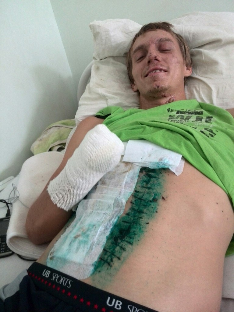 Работая волонтёром, Руслан разбирал завалы в Куйбышевском районе Донецка, когда нашёл фломастер. Его крышку он открыл дома. Фломастер оказался минной ловушкой. В результате взрыва Руслан получил травму правой кисти (позже её ампутировали), обширные раны шеи и брюшной полости с разрывом печени. Сейчас парень находится дома и нуждается в хирургической помощи - недавно у него возникли осложнения кишечника.
