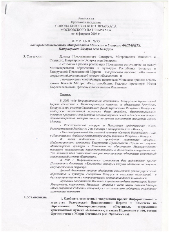 | 19 НОЯБРЯ 2015 (Четверг) 16:13:01 Этой осенью Республиканскому фестивалю современной христианской музыки "Благовест" исполняется 10 лет. Этот фестиваль создан с душой и проработан духом – так писали о нём ещё в первые годы жизни. Немногие помнят, что начинался он с городского фестиваля современной христианской музыки "Благовест", но за эти годы так окреп, что охватил всю страну, дал жизнь множеству культурных проектов, успел многократно побывать с гастролями за рубежом, а главное - фестиваль остаётся любимым и доступным каждому – он по-прежнему собирает полные залы.- Это поразительно, но все наши инициативы не просто живут, но развиваются, и по сей день рождают новые проекты! – говорит несменный руководитель фестиваля, автор проекта "Благовест" Вячеслав Бобков. Впервые фестиваль прошёл в 2005 году и сразу получил поддержку на всех уровнях: уже через год его утвердил Синод и "Благовест" вошёл в программы сотрудничества государства и Церкви. - Большим толчком к развитию послужило благословение митрополита Филарета. В то время была только идея фестиваля, был наработан материал. Помню, я принёс владыке свои рукописи, он выслушал меня, положил на них свою руку и благословил, - вспоминает Вячеслав. – А спустя пару лет владыка уже присутствовал на нашем первом музыкальном спектакле "Свет рождественской звезды". Позже фестиваль благословили и российские патриархи - Алексий II и Кирилл. Постепенно фестиваль "Благовест" перерос в областной благотворительный фестиваль-марафон "Крылья Ангела", который сегодня включён в Программу сотрудничества в сфере образования Миноблисполкома и Минской митрополии БПЦ на 2015-2020 годы. Оглядываясь назад, вспоминая, как всё начиналось, становится понятно, какой огромный путь прошёл фестиваль за эти годы. Своими истоками он уходит в 90-е годы и напрямую связан с приходом к вере своего идейного вдохновителя Вячеслава Бобкова. - Это было время девальвации всех ценностей, социальной неустроенности со всеми вытекающими последствиями... В какой-то момент стало очевидно, что дальше так жить нельзя, нужно что-то менять, - делится Вячеслав. Трагедии в жизни близких людей глубоко его потрясли. В поисках смысла жизни Вячеслав обернулся к Богу. Крестился. Новый этап в жизни, в лоне Православной Церкви, повлиял на его мировоззрение и творчество. Темы семьи, детства, духовных и нравственных ценностей вышли на первый план. - Человеку нужно одно – внимание. Нам друг друга необходимо "отогреть". Задать каждому простой вопрос : Как ты, радость моя? Как это делал Серафим Саровский. Ведь все мы - единая большая семья, все мы дети одного Бога. Поэтому, как в любой семье, мы стараемся согреть ближнего своими песнями и стихами, предлагаем зрителю вернуться в детство, когда мы ещё не знали бранных слов, грусти, глубины человеческих страданий, когды мы были подобны ангелам - дети именно таковы, в них всё возвышенно и чисто. С годами мы это утрачиваем. И мы спрашиваем - почему? Кто виноват? На концерте происходит откровение - мы находим ответ на этот вопрос. Виноваты мы сами, взрослые... Мы понимаем, как важно просить прощение у детей и друг у друга, как важно быть вежливыми и внимательными, заботливыми и сострадательными каждую минуту, в любой ситуации быть чуткими и великодушными, как учит этому святоотеческое наследие. Когда мы любим, мы с Богом. Поэтому 