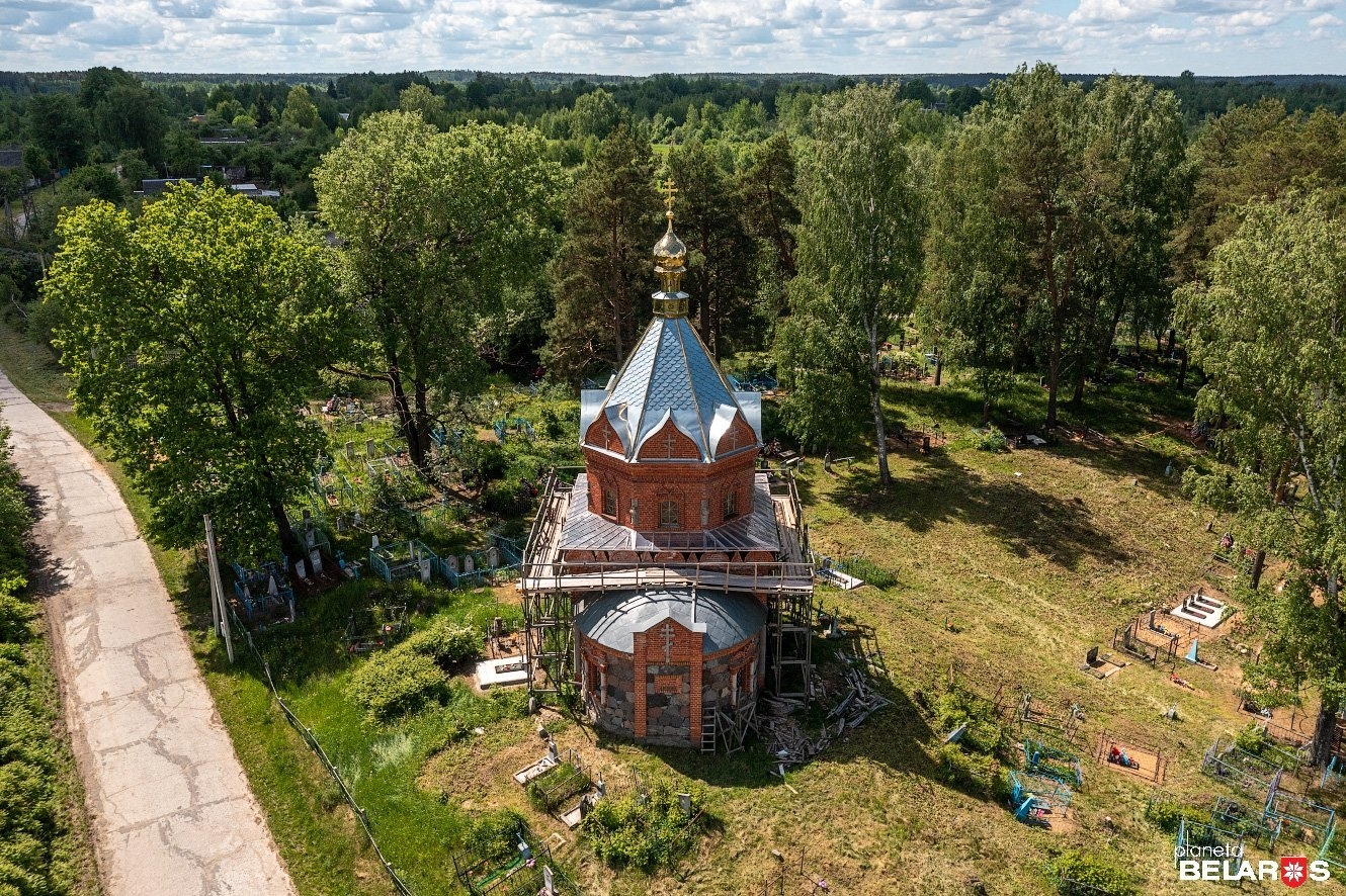 Почитав на сайте Полоцкой епархии эту заметку, вспомнила, что несколько лет назад проезжала по этой дороге и, увидев промелькнувший за окном необыкновенной красоты храм, подумала: откуда такое великолепие и почему так сиротливо стоит у дороги? Но теперь в заметке сообщалось, что священник Александр Талеренок, его настоятель, просит помощи в восстановлении святыни. И вот еду в Полоцк, созваниваюсь с отцом Александром, и вновь нас встречает часовня на высоком холме, у дороги, только теперь уже окруженная строительными лесами.