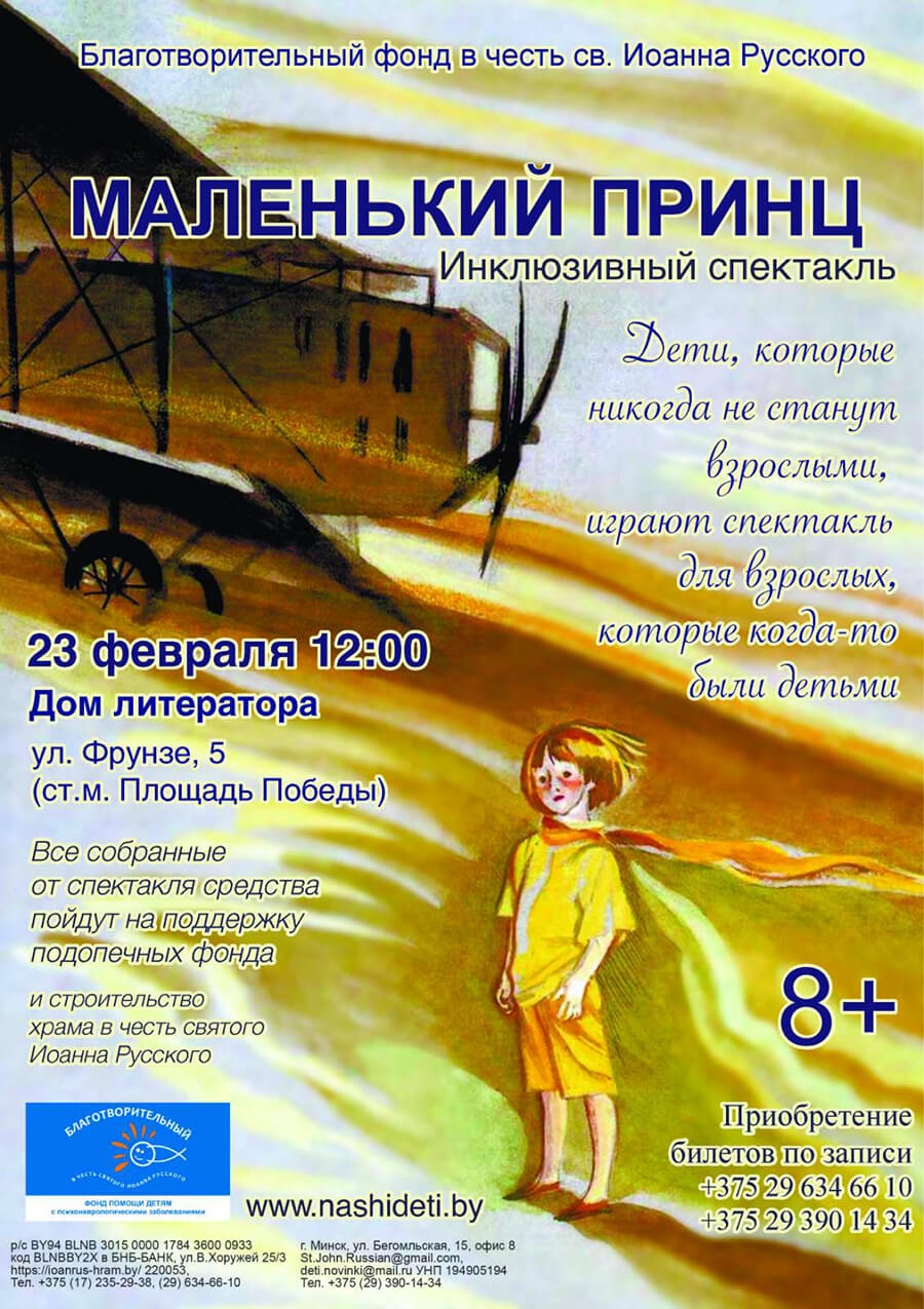 | 19 ФЕВРАЛЯ 2020 (Среда) 16:09:52 23 февраля в минском Доме литераторов, на Фрунзе, 5, в полдень, состоится показ уникального спектакля "Маленький принц".Вместе с профессионалами в нём играют особенные актёры, подопечные Благотворительного фонда в честь святого Иоанна Русского с особенностями психофизического развития. Каждый из этих актёров и есть "Маленький принц", сохранивший такие качества души, как непосредственность, нежность, незлобивость, то, что очень часто теряют обычные люди. Художественным руководителем инклюзивного театра и режиссёром "Маленького принца" является актёр Национального академического драмтеатра имени Максима Горького Александр Жданович, известный белорусскому зрителю по образу "Маляваныча", ведущего детской программы. Все собранные от спектакля "Маленький принц" средства пойдут на поддержку и улучшения качества жизни воспитанников психоневрологических интернатов, которых окормляет Елисаветинский монастырь Минска. Более подробная информация по ссылке. По вопросам приобретения пригласительных билетов обращаться по телефонам: +375 44 760 29 74 +375 29 634 66 10 Александр Жданович, режиссёр инклюзивного спектакля "Маленький принц": "Это спектакль о них, об этих ребятах, которые никогда не повзрослеют, которые так же как и Маленький принц являются неким символом вечного детства. К чему мы призываем и взрослых – открыть себя! Искренне говорю: мы сделаем всё возможное, чтобы эти 50 или 60 минут, которые Вы проведёте вместе с нами, чтобы Вы почувствовали, что это не просто какой-то "дежурный" спектакль… Вы можете приходить, конечно, и с детьми, но только не совсем младшего школьного возраста, чтобы всё-таки эта философская притча, чтобы те тексты, которые заложены Экзюпери, чтобы они были поняты, пережиты вместе с Вами. Это спектакль для семейного просмотра. У нас такой посыл: "Дети, которые никогда не станут взрослыми, играют спектакль для взрослых, которые когда-то были детьми". Ещё раз говорю, вся информация на сайте Свято-Елисаветинского монастыря (obitel-minsk.ru), приходите, мы Вас очень ждём!"/ sobor.by/ (просмотров 2995) |