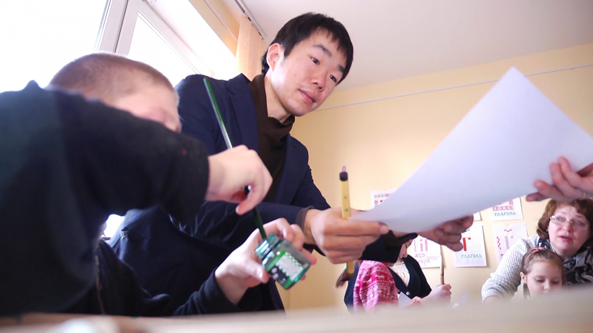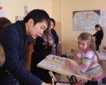 В ходе мастер-класса Хитоши научил ребят рисовать японские иероглифы: цифры и слова «счастье», «Япония», «Христос Воскресе», «любовь».