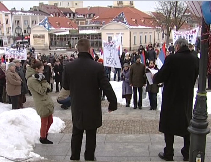 | 27 ФЕВРАЛЯ 2013 (Среда) 16:16:40 В Польше уже много лет растет движение солидарности с сербским народом Косово и Метохии. 26 февраля в Белостоке состоялся ряд акций в поддержку страждущих за веру жителей Косово, который открылся молебном в Иоанно-Богословском храме города. Подробности у корреспондентов Восточноевропейского бюро телеканала «СОЮЗ»В белостокском храме св. апостола и евангелиста Иоанна Богослова верующие после литургии не спешили расходиться. Несмотря на заботы буднего дня все остались на молебен перед образом святого сербского царя Лазаря. Молитва о страждущем сербском народе Косова и Метохии в этом храме не случайна – Иоанно-Богословский приход известен многолетними связями с Сербией. О том, что происходит в многострадальном сербском крае, здесь узнают не из европейских СМИ, а из путешествий на Балканы, из общения с друзьями в Сербии и Черногории Протоиерей Марек Вавренюк, настоятель храма св. апостола и евангелиста Иоанна Богослова (Белосток, Польша): «2013 год, который только начался, уже стал очень трагичным для Косово и Метохии. В храмах и монастырях происходят взрывы. До нас доходят сведения, что разрушаются и сербские кладбища - взрываются бомбы, уничтожаются памятники». Молебен о страждущих сербах на косовской земле состоялся 26 февраля – в день памяти преп. Симеона Мироточивого, отца святителя Саввы Сербского. В этот день в храме святого апостола и евангелиста Иоанна Богослова звучала молитва на церковнославянском и на сербском языках. Но ее смысл был понятен каждому без перевода. Настоятель храма обратился к собравшимся с просьбой ежедневно молиться о наших страждущих братьях– это первое, что мы можем сделать для них. Отец Марек отметил, что до сих пор мировые СМИ подвергают общественное мнение информационным бомбардировкам о злых сербах, которые не хотят быть законопослушными гражданами новоиспеченного государства с центром в Приштине. Правда, никто не дает на мировые телеканалы новости о вопиющих фактах избиения сербских детей и стариков, о разрушении кладбищ, попытках взорвать храмы и древние обители. В этом случае правду в Польше должны доносить до общества сами верующие. Протоиерей Марек Вавренюк, настоятель храма св. апостола и евангелиста Иоанна Богослова (Белосток, Польша): «Может, это слишком маленький голос. Но помним, что из малых элементов, малых частиц создается что-либо великое, о чем говорят. Благодарю всех кто пришел к нам. Вижу здесь людей, которые приехали в Белосток за десятки километров отсюда…В любое время, где-бы мы не находились, будем помнить о наших страждущих братьях, которые нуждаются в нашей молитвенной поддержке…» Стоит отметить, что православная общественность Польши оказывала сербам не только молитвенную поддержку. Здесь собирали гуманитарную помощь для сербских сел, оказавшихся в гетто, были собраны значительные средства на восстановление монастыря свв. бессребреников Косьмы и Дамиана в косовском Зочиште. И вот сейчас, в центре Белостока, на площади перед ратушей несколько сотен человек пришли на митинг поддержки страждущего православного народа в Косове, на митинг, приуроченный к 5-летней годовщине самопровозглашения независимости этого края. Что требовали митингующие (а собрались здесь не только православные, солидарность с сербами высказали и многие католик