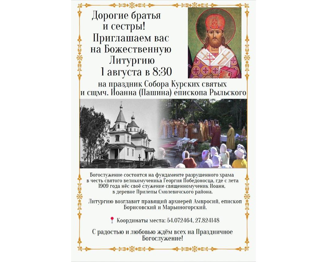 | | 26 ИЮЛЯ 2025 (Суббота) 21:57:38 1 августа, в праздник Собора Курских святых и священномученика Иоанна (Пашина, епископа Рыльского, на фундаменте разрушенного храма великомученика Георгия Победоносца состоится Божественная литургия. Богослужение возглавит епископ Борисовский и Марьиногорский Амвросий.