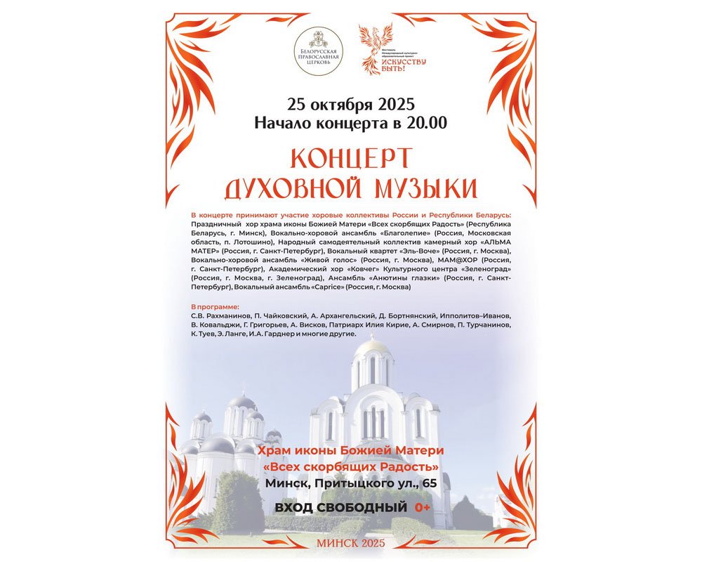 25 октября, по благословению митрополита Минского и Заславского Вениамина, Патриаршего Экзарха всея Беларуси, в приходе иконы Божией Матери "Всех скорбящих Радость" города Минска состоится концерт духовной музыки. Меропряитие пройдет в рамках Международного культурно-образовательного проекта "Искусству быть".