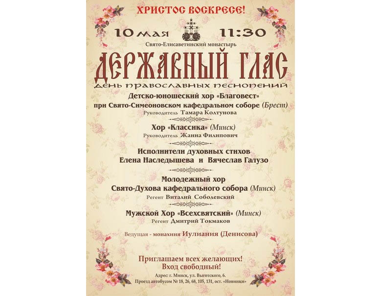 10 мая в 11.30 в Свято-Елисаветинском монастыре пройдёт фестиваль православных песнопений «Державный глас», в котором примут участие церковные, светские, профессиональные и любительские хоры.