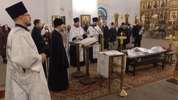 | Молитвенно проститься с отцом Евгением пришли родственники, священнослужители, настоятель протоиерей Игорь Коростелев и клирики прихода, миряне, знавшие усопшего. "Отец настоятель, отцы, братья и сестры, прихожане, мы собрались, чтобы проводить в последний путь отца Евгения. Смерть его неожиданна для нас. И болезнь, через которую он прошел, она служила своего рода некоторым приготовлением для его души. Мы знаем, что в болезни человек многое испытывает, душа и тело проходят через страдания, скорби, ограничения. Через это душа получает вместе с тем очищение и приготовление к вечности. Отец Евгений, можно сказать, один из старейших клириков Минской епархии, по хиротонии 33 года служения в священном сане. Лишь только еще начиналось возрождение Церкви, и он один из первых пришел, чтобы посвятить свое служение Богу, Матери-Церкви. Памятно его смиренное и вместе с тем усердное служение, заботливое о людях и этому служению он отдавал себя. Сегодня время, когда нам надлежит воздать ему за его труды, скромные, усердные, молитвы, ходатайства за него, чтобы Господь упокоил его душу там, где нет уже не болезней, ни скорбей, ни страданий, но жизнь бесконечная. Будем об этом молиться, уповая на милость Божию. Вечный покой и Царство Небесное да подаст Господь почившему верному служителю Своему протоиерею Евгению", - обратился к верующим митрополит Вениамин. |