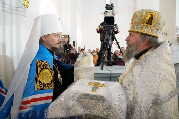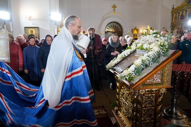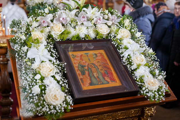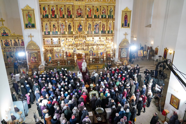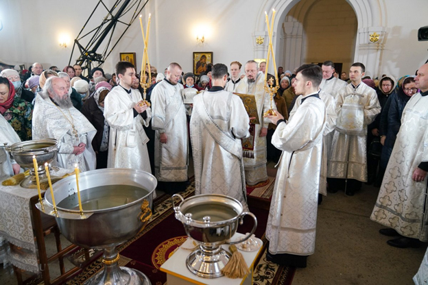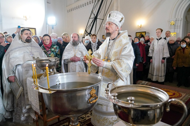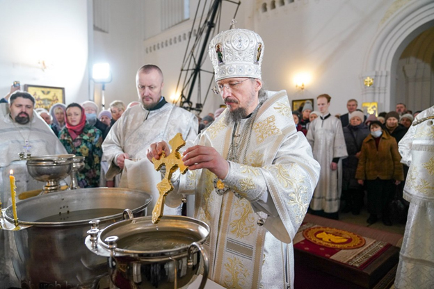 | 19 января 2023 года, в праздник Крещения Господня, Митрополит Минский и Заславский Вениамин, Патриарший Экзарх всея Беларуси, совершил Божественную литургию и великое освящение воды в храме в честь иконы Божией Матери "Всех скорбящих Радость" города Минска. Трансляция богослужения велась на телеканале "Беларусь 3". Сурдоперевод осуществляли переводчик жестового языка Валентина Фёдоровна Чудакова и клирик храма иконы Божией Матери "Скоропослушница" в городе Гомеле иерей Александр Пранкевич. Его Высокопреосвященству сослужили: председатель Синодального отдела БПЦ по взаимодействию с казачеством, председатель Синодального отдела БПЦ по церковному искусству, архитектуре и реставрации, благочинный 2-го Минского городского округа, настоятель прихода храма иконы Божией Матери "Всех скорбящих Радость" города Минска протоиерей Игорь Коростелёв; протоиерей Игорь Латушко; секретарь Минской епархии протоиерей Андрей Волков и клирики храма. Диаконский чин возглавил протодиакон Владимир Назаров. Богослужебные песнопения исполнил приходской хор под управлением Ольги Янум. После сугубой ектении Патриарший Экзарх вознёс молитву о восстановлении мира. Проповедь перед Причастием произнёс протоиерей Виктор Мельников. По окончании Божественной литургии Патриарший Экзарх поздравил духовенство и прихожан с праздником Богоявления и обратился со словом назидания. В завершение Митрополит Вениамин поздравил причастников с принятием Святых Христовых Таин и преподал всем архипастырское благословение. |